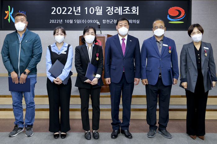 이날 정례조회에서는 2022년 상반기 모범공무원(이정수, 박재홍, 김신혜), 지방세정 발전 연구과제 발표 최우수(권지영), 제14회 자원순환의 날 유공(차승한), 모범이장(합천읍 금양마을 이상덕, 봉산면 계산2구마을 이병조, 쌍책면 진정마을 하영진), 2022년 공무원 규제혁신 과제 공모전 우수공무원(최우수 김홍석, 우수 방형석, 장려 이순덕·김동훈·이연희) 등 총 13명에 대한 표창 및 상장을 전수했다.