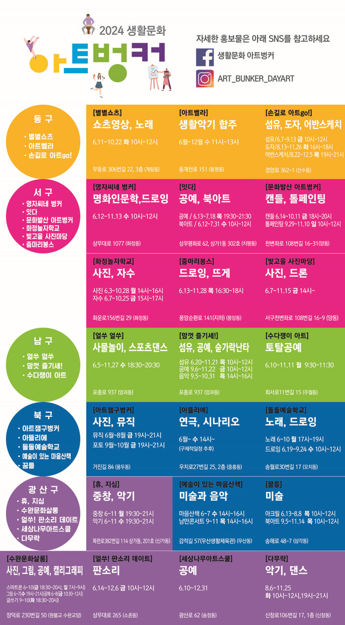 광주시는 지난해부터 공공·민간의 유휴공간을 거점으로 음악·미술·쇼츠·공예 등 주민이 스스로 기획하고 운영하는 일상 속 문화예술 활동을 지원하기 위해 아트벙커 사업을 진행하고 있다.