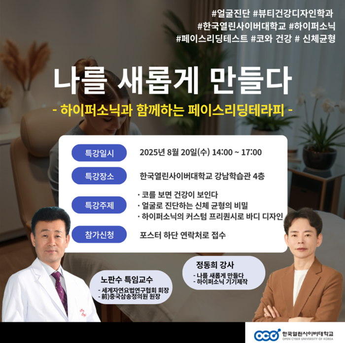 특히 오는 8월 20일(수)에는 한국열린사이버대학교에서 ‘하이퍼소닉과 함께하는 페이스리딩테라피 특강’이 예정되어 있다. 해당 특강은 코를 통해 신체 건강을 진단하고, 얼굴형을 통해 몸의 균형을 파악하는 이론과 실습을 병행하는 구성으로 진행할 계획이다.