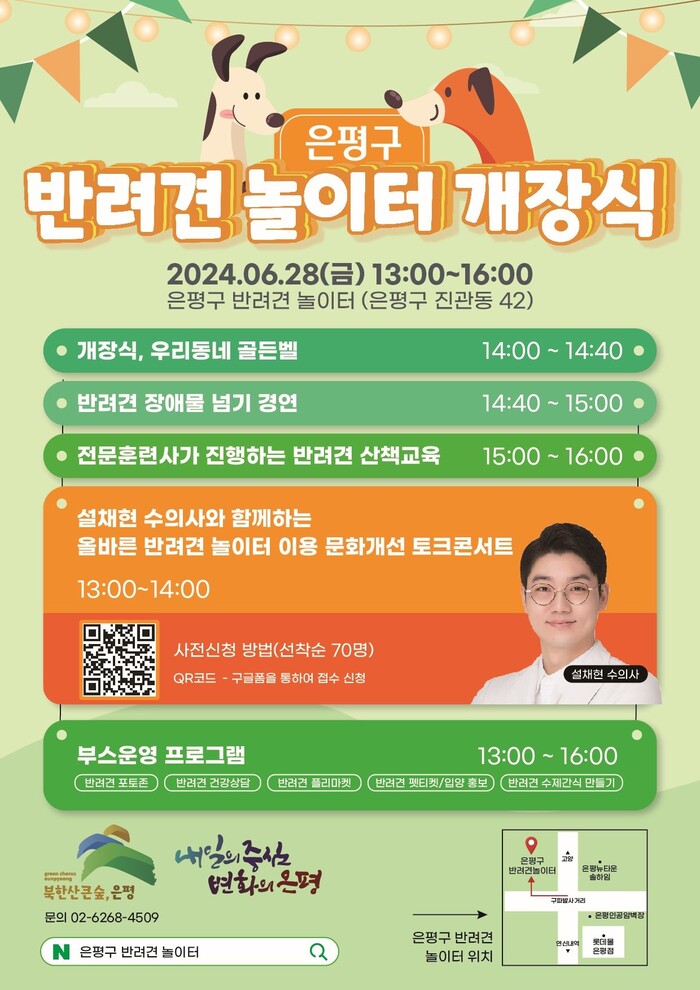 반려견 놀이터 개장식에는 ▲설채현 수의사와 함께하는 올바른 반려견 놀이터 이용 문화개선 토크콘서트 ▲반려견, 우리동네 골든벨 ▲반려견 장애물 넘기 ▲반려견 산책 및 문제 행동 교육 등 행사 프로그램을 연다.