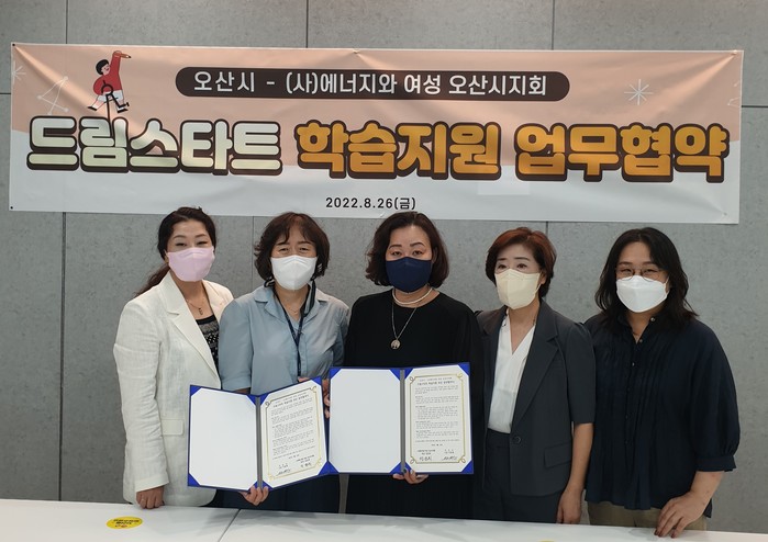 경기 오산시가 최근 (사)에너지와 여성 오산시지회와 취약계층 아동 학습 지원을 위한 '드림스타트 학습 지원 업무협약'을 체결했다. 이번 협약은 드림스타트 취약계층 아동을 대상으로 학습의 기회를 제공해 가정의 경제적 도움과 아동의 정서적 안정과 성취감을 도모하기 위해 마련 됐다. 사진은 이날 협약 체결 후 양기관 관계자들이 기념촬영을 하는 모습. (사진제공=오산시청)
