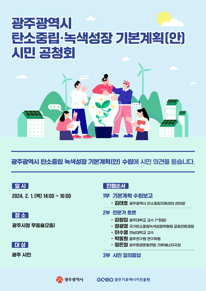 손인규 기후대기정책과장은 “탄소중립과 기후위기 극복을 위해 마련한 광주광역시 탄소중립・녹색성장 기본계획(안)이 실행력 있게 수립될 수 있도록 시민 여러분의 많은 관심과 참여를 부탁드린다.”고 말했다.