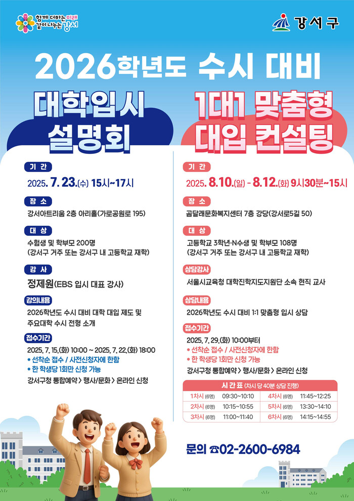 [시민일보 = 박소진 기자] 서울 강서구(구청장 진교훈)는 2026학년도 수시 대비를 위해 ‘대학입시 설명회’와 ‘1대1 맞춤형 대입 컨설팅’을 개최한다.