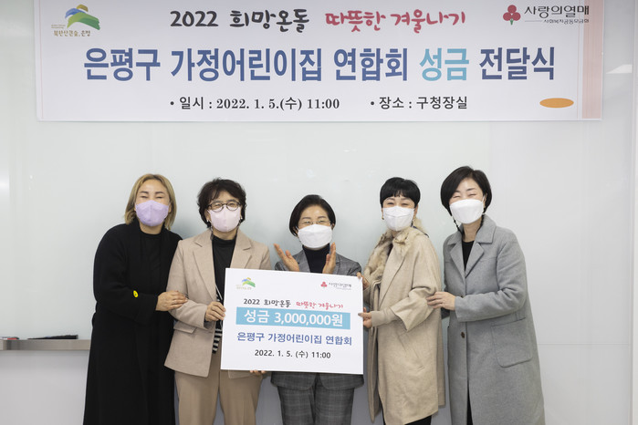 서울 은평구 드림스타트는 최근 은평구 가정어린이집연합회로부터 어려운 이웃들을 위한 ‘2022 희망온돌 따뜻한 겨울나기’ 성금 300만원을 기탁받았다. 사진은 기탁식에서 김미경 구청장(가운데)과 관계자들이 기념촬영을 하는 모습. (사진제공=은평구청)