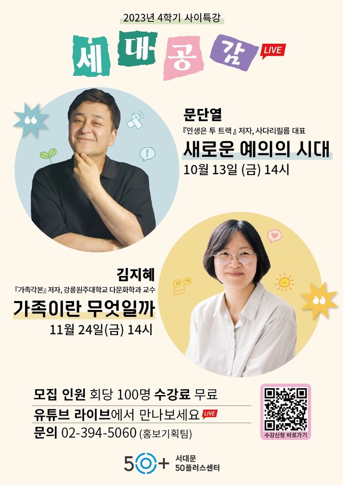 또한 문단열 사다리필름 대표가 ‘새로운 예의의 시대’, 김지혜 강릉원주대학교 다문화학교 교수가 ‘가족이란 무엇일까’란 제목으로 10월 13일과 11월 24일 각각 온라인 명사 특강을 진행한다.