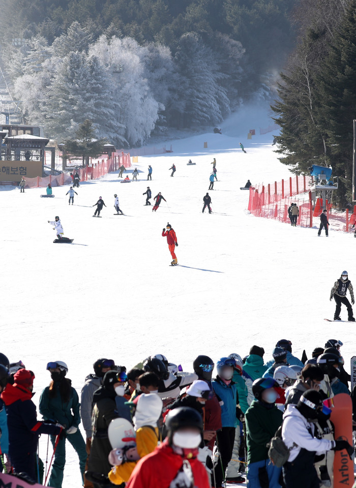 강원도 내 주요 스키장이 올겨울 개장 후 첫 주말을 맞이한 28일 평창군 용평스키장을 찾은 스키어와 스노보더들이 줄지어 리프트 탑승을 기다리고 있다.