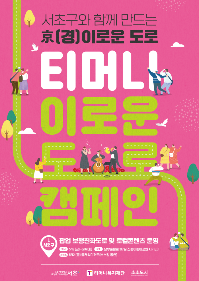 [시민일보 = 이대우 기자] 서울 서초구(구청장 전성수)가 오는 12~16일 5일간 서초음악문화지구 내 신중어린이공원 일대서 티머니복지재단과 함께 ‘이로운 도로 캠페인’를 진행한다.