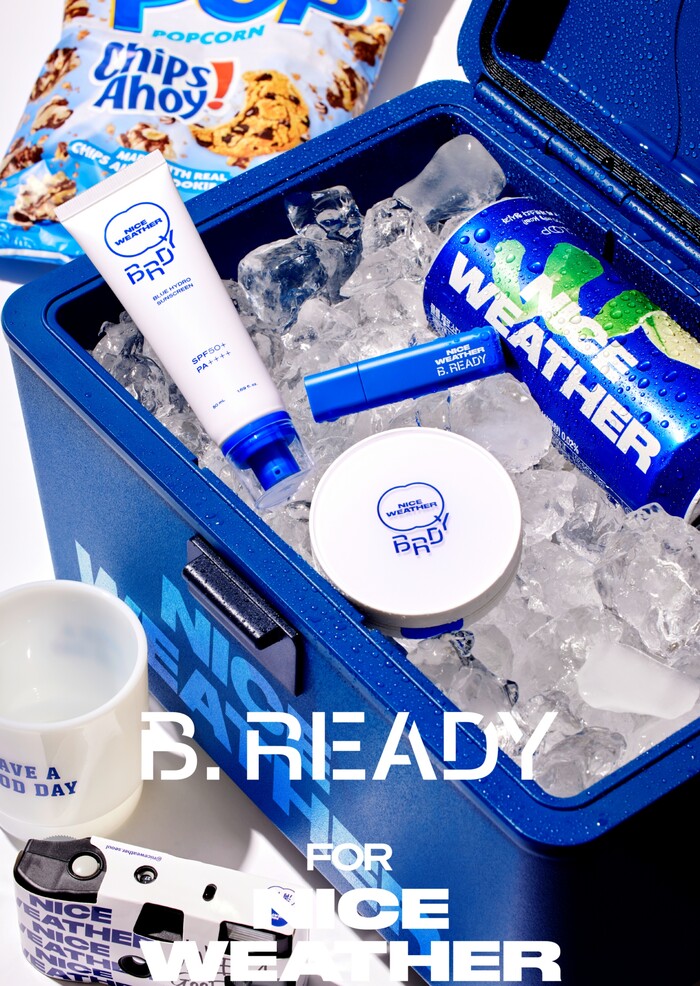 두 브랜드의 대표 컬러인 청량한 블루를 활용해 ‘비레디 포 나이스웨더 온더 블루 비치(B.READY for NICE WEATHER on the BLUE BEACH)’를 테마로 구성했다.