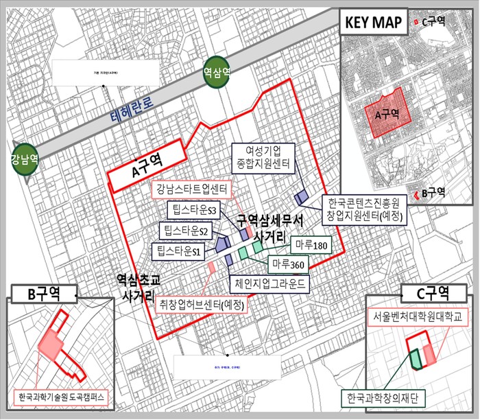 12일 구에 따르면 강남구가 ‘벤처·스타트업 특화거리’로 조성하고 있는 역삼로 ‘창업가거리’는 132개 벤처기업, 강남스타트업센터, 팁스(TIPS)타운·마루360 같은 창업지원기관, 대학·연구기관 등 창업·금융·연구기관이 모여있다.