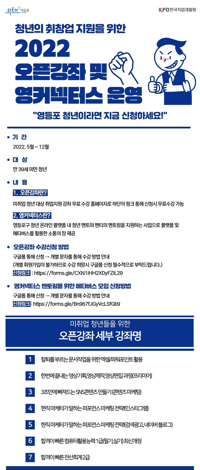 오픈강좌와 영커넥터스 멘토링은 영등포구 청년온라인플랫폼에 게시된 구글폼을 통해 신청할 수 있으며, 보다 자세한 사항은 영등포구청 사회적경제과로 문의하면 된다.