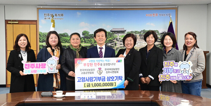 한국여성농업인 진주시연합회(회장 이보화)와 고흥군연합회(회장 신라경)은 5일 기업인의 방에서 양 단체의 돈독한 우정 다짐과 농업·농촌 지역경제 활성화를 위해 ‘고향사랑기부제 상호 교차 기탁식’을 가졌다.