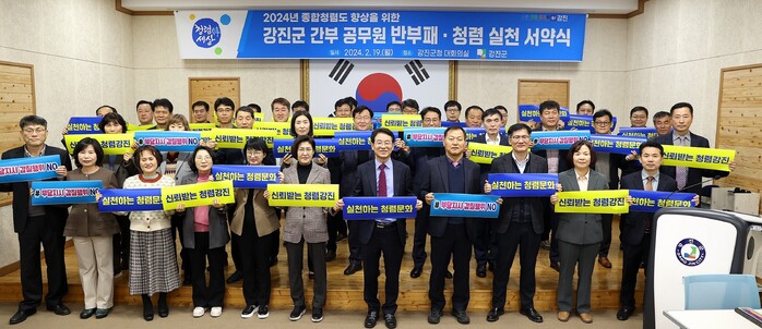 이날 서약식은 신뢰받는 청렴강진, 실천하는 청렴문화를 조성하기 위해 전직원의 서약 참여와 반부패ㆍ청렴 실천으로 청렴 조직문화와 청렴 결의를 다짐하기 위해 마련됐다.