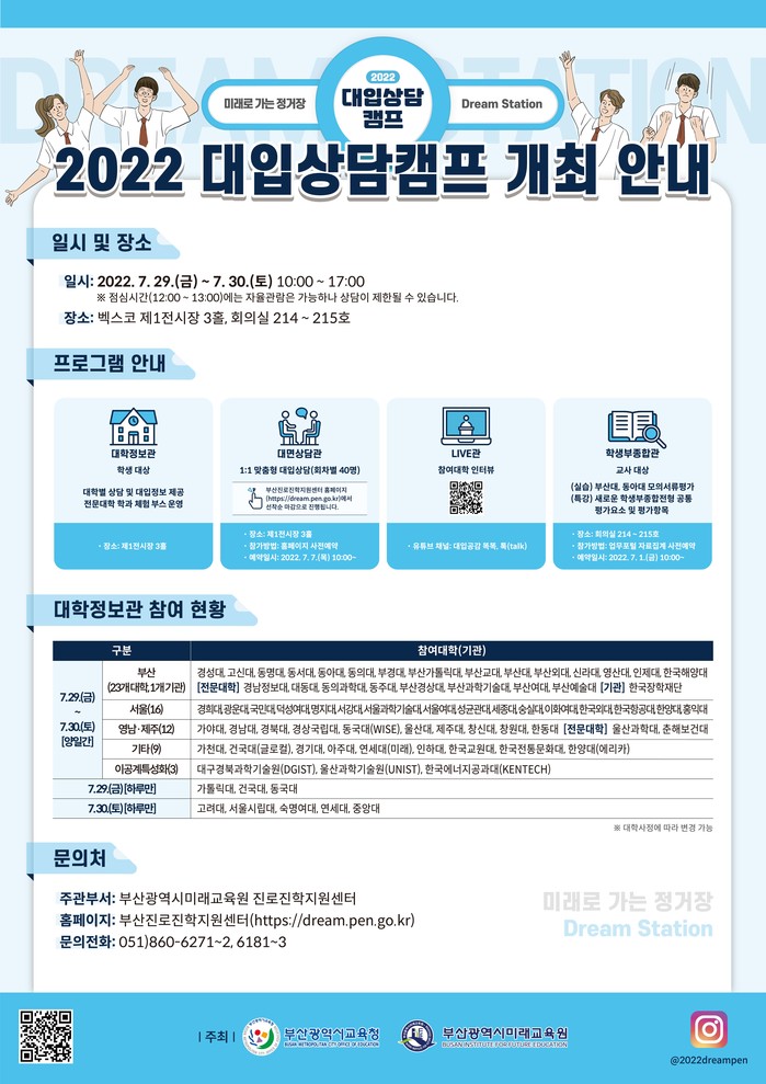 부산광역시교육청(교육감 하윤수)은 생생한 대입정보와 맞춤형 1대 1 대입상담 기회를 제공하기 위해 오는 7월 29일과 30일 이틀간 오전 10시부터 오후 5시까지 해운대구 벡스코에서 ‘2022 대입상담캠프’를 개최한다고 4일 밝혔다.
