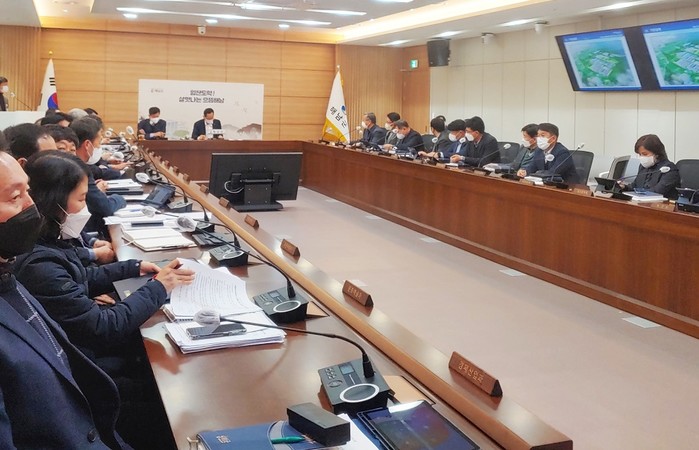 | ▲ 명현관 해남군수가 지난 19일 해남군청 상황실에서 기후변화대응 농업연구단지 최종 용역 보고회를 주재하고 있다. / 사진 = 해남군 제공 |