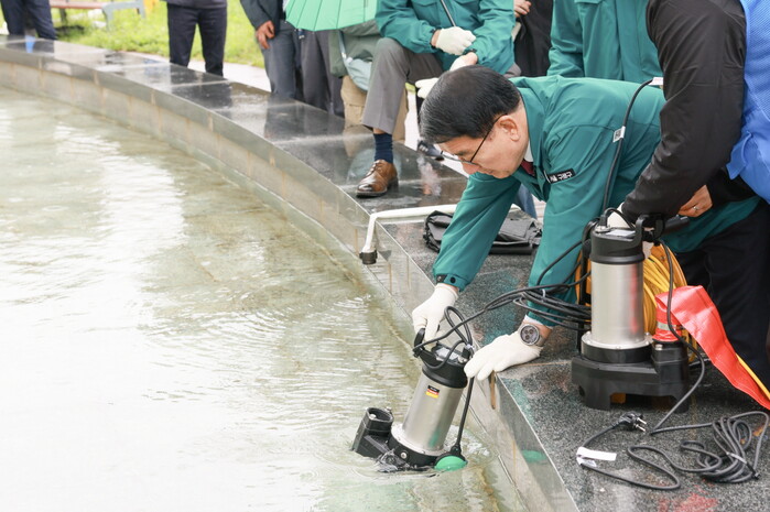 | ▲ 문헌일 구청장이 수중펌프를 작동해보고 있다. (사진=구로구청 제공) |