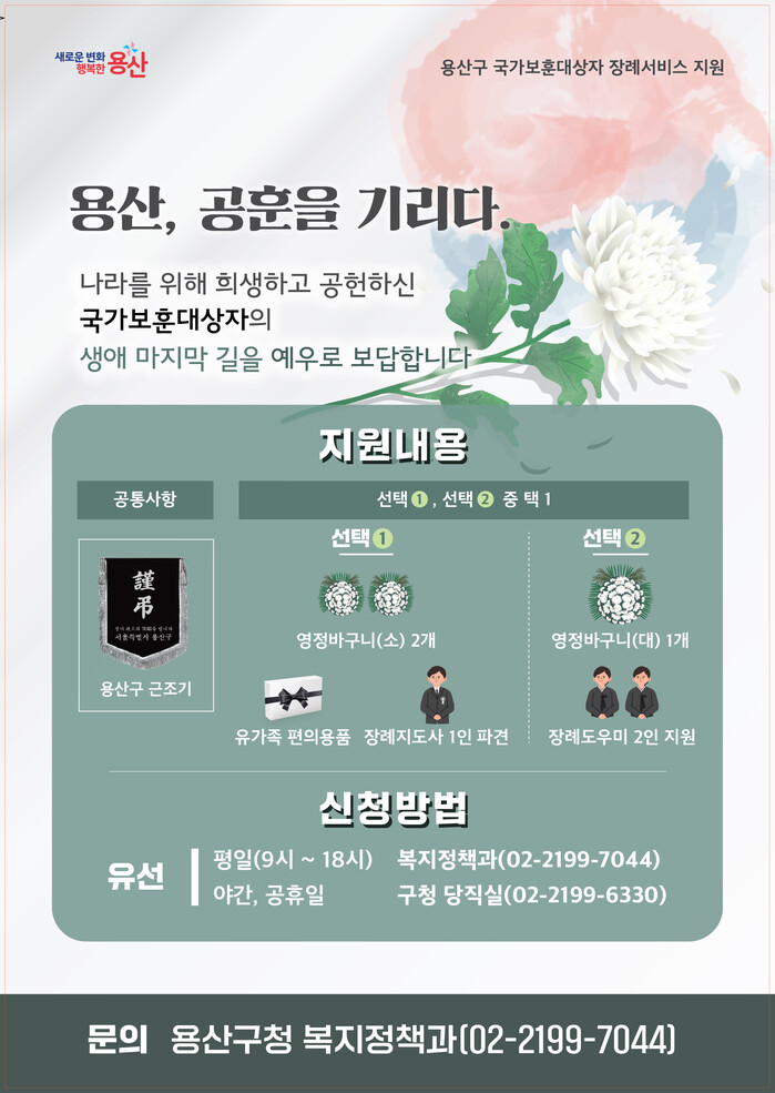 [시민일보 = 변은선 기자] 용산구(구청장 박희영)가 국가보훈 대상자의 마지막 가시는 길을 예우하기 위한 장례 지원 서비스를 제공 하고 있다.