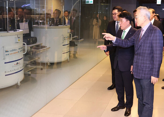 | ▲ 함영주 하나금융그룹 회장(왼쪽에서 두 번째)이 협약식을 마치고 차병원의 난자은행을 방문해 차광렬 차병원 글로벌종합연구소장(왼쪽에서 세 번째)으로부터 난임생식의학 전문기술에 대해 설명을 듣고 있다. (사진=하나금융그룹 제공) |