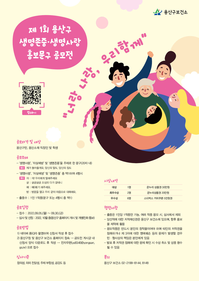 [시민일보 = 홍덕표 기자] 서울 용산구(구청장 박희영)가 오는 30일까지 '제1회 생명존중·생명사랑 홍보문구 공모전'을 개최한다.