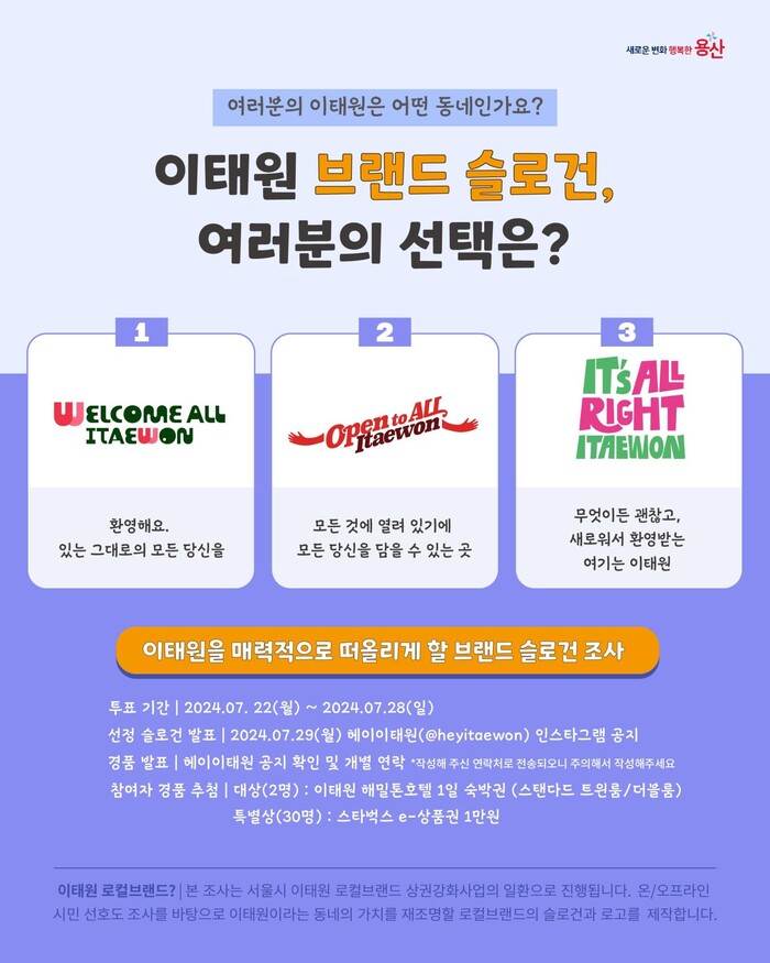 상권 상표화의 하나로 이태원 로컬브랜드 키 비주얼도 개발 중이다. 오는 28일까지 온라인 투표를 진행하고 29일 최종 선정한 키 비주얼을 일반에 공개할 예정이다. ‘이태원다움’을 담은 표어(슬로건)로 이태원 상권 브랜드 메시지를 시각화하는 전략이다. 헤이이태원 인스타그램에서 투표할 수 있다.