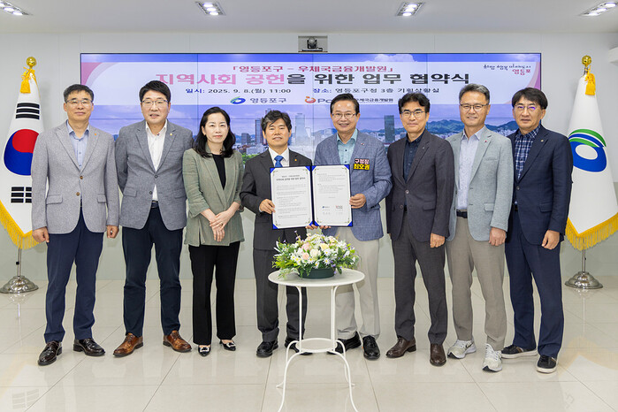 영등포구가 지난 8일 구청 기획상황실에서 우체국금융개발원과 지역사회 공헌을 위한 업무협약을 체결했다. 사진은 최호권 구청장(오른쪽 네 번째)이 신대섭 우체국금융개발원장 및 참석자들과 기념촬영을 하고 있는 모습. (사진=영등포구청 제공)