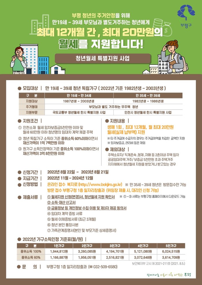 [인천=문찬식 기자] 인천 부평구가 오는 22일부터 1년간 월 최대 20만원, 최대 12회를 지원하는 '무주택 청년 월세 지원 사업'을 시행한다.