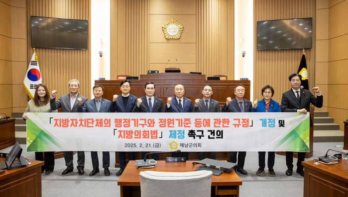 해남군의회는 “국회가 국회법을 통해 독립적인 운영의 법적 근거를 갖추고 있듯이, 지방의회 역시 독립기관으로서 집행기관을 견제하고 감시하는 본연의 역할을 수행하기 위해서는 자율성 확보가 필수적”이라고 강조하며, 정부에 '의회사무기구 설치 기준을 인구 및 지방의원 정수로 한정한 ‘지방자치단체의 행정기구와 정원기준 등에 관한 규정’의 즉각 개정', '지방의회의 독립성을 보장하고 조직구성권과 예산편성권을 포함한 ‘지방의회법’의 조속한 제정'을 강력히 촉구했다.