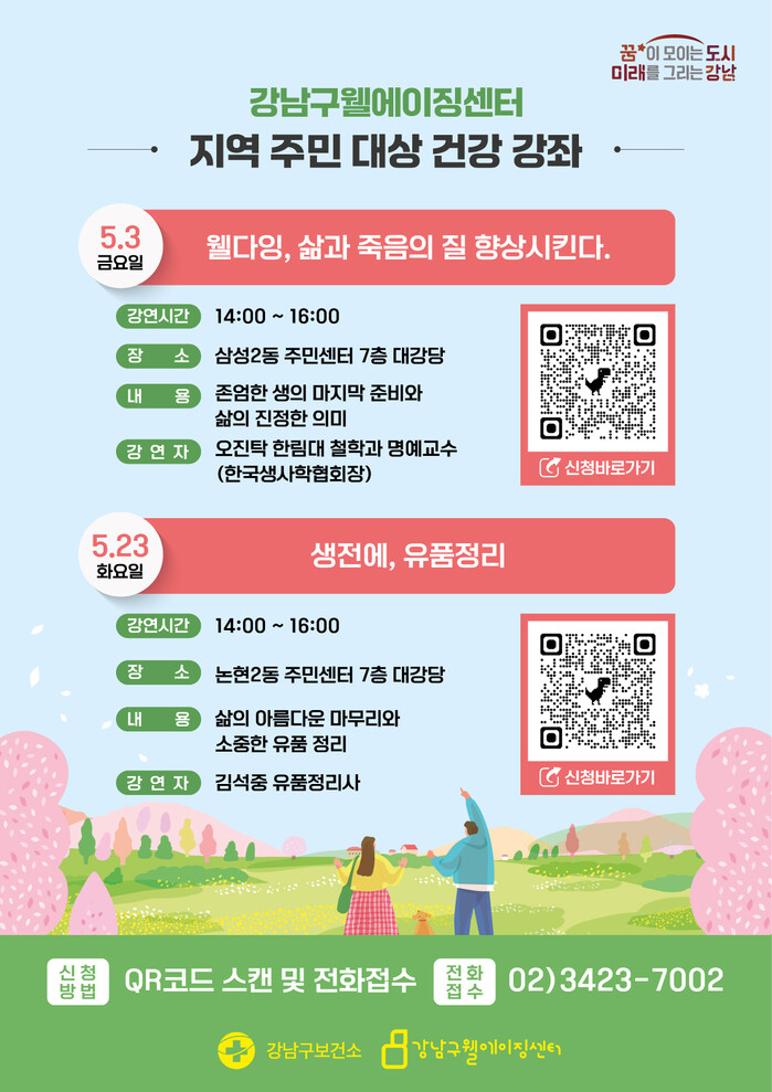 [시민일보 = 이대우 기자] 서울 강남구(구청장 조성명)가 5월 가정의 달을 맞아 60세 이상 구민을 대상으로 웰다잉 특강을 개최한다.