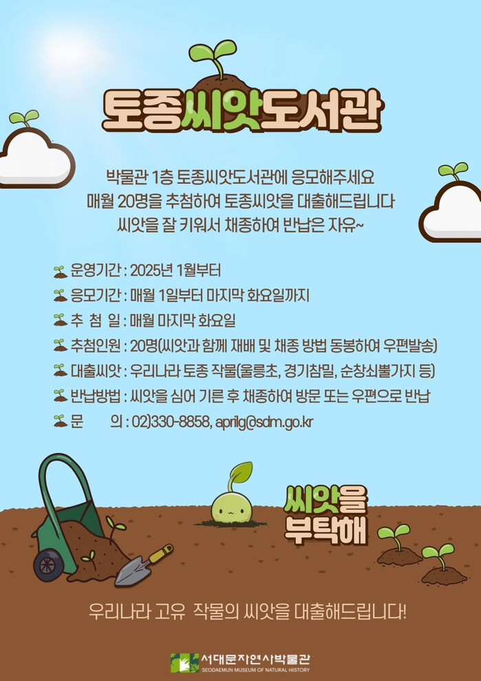 [시민일보 = 이대우 기자] 서대문자연사박물관이 관람객에게 울릉초, 경기참밀, 순창쇠뿔가지 등 우리나라 고유 작물의 씨앗을 대출해 주는 ‘토종씨앗도서관’ 운영에 들어갔다.