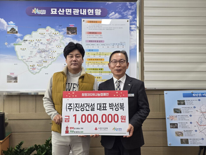 이창기 묘산면장은 “경기가 어려운 상황에서도 이웃을 위해 따뜻한 손길을 내밀어 주셔서 감사드린다”며 “기탁해 주신 성금은 도움이 필요한 이웃들에게 소중히 잘 전달하겠다”고 전했다.