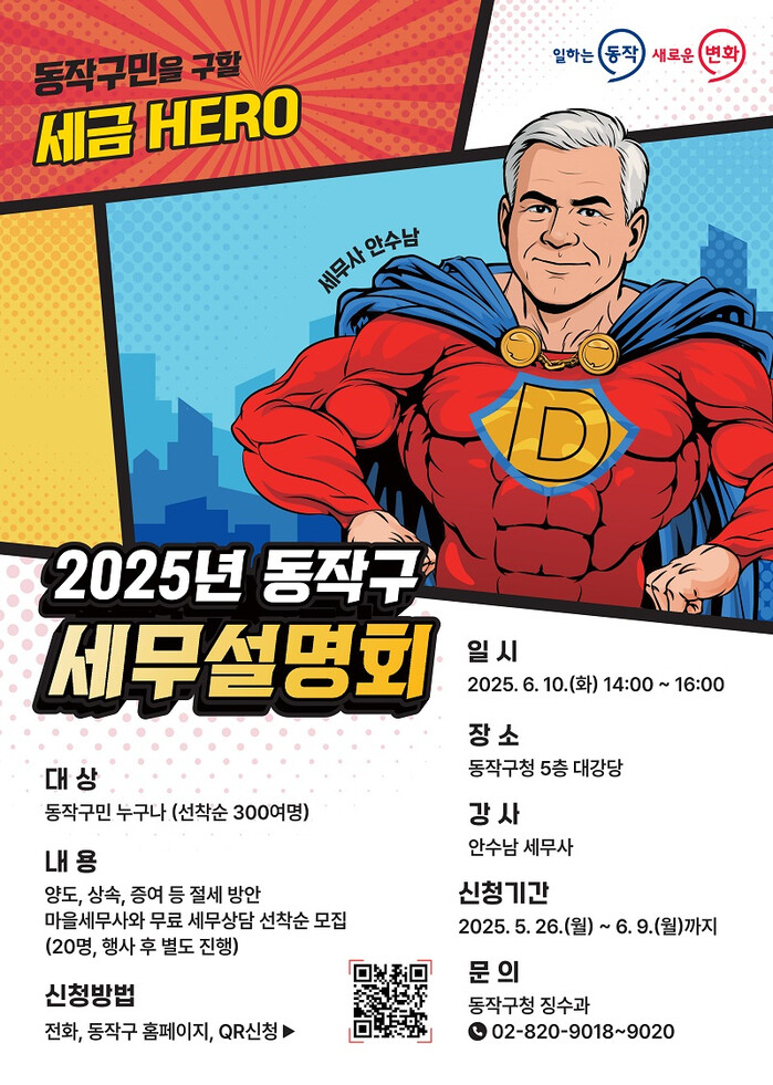 [시민일보 = 여영준 기자] 동작구(구청장 박일하)가 오는 6월10일 오후 2~4시 구청 5층 대강당에서 ‘동작구민을 구할 세금 HERO '2025년 세무설명회’를 개최한다고 28일 밝혔다.