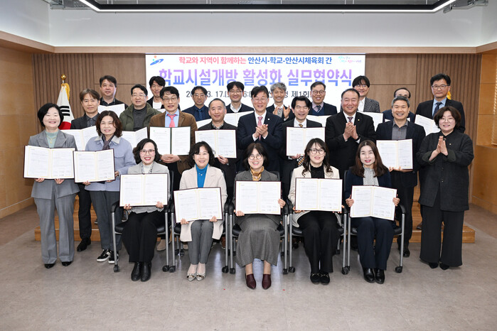 | ▲ 이민근 안산시장이 2026년 3월 17일 안산시청에서 '2026년 상반기 학교시설개방 활성화 실무협약식'을 진행하고 기념촬영을 하고 있다 /사진제공=안산시 |