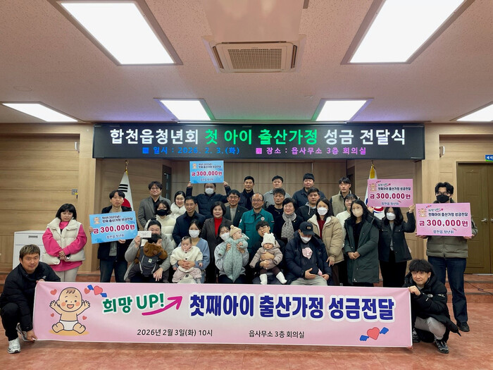 합천읍청년회 유성율 회장은 “첫아이의 탄생을 진심으로 축하드리며, 이번 성금이 출산가정에 작은 응원과 힘이 되길 바란다”며, “앞으로도 합천읍청년회는 아이와 부모가 함께 웃을 수 있는 따뜻한 지역사회를 만드는 데 앞장서겠다”고 말했다.