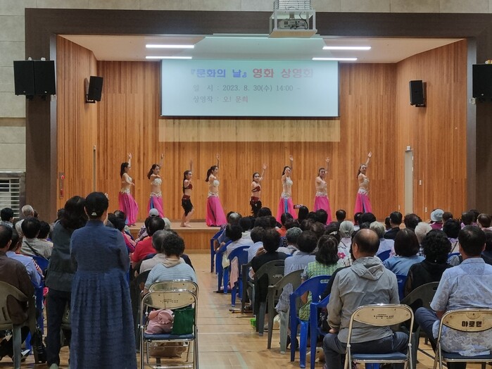 이날 밸리댄스팀의 공연을 시작으로 참석자들은 자원봉사회(회장 정숙하)에서 준비한 떡을 먹으며 영화를 시청했다.