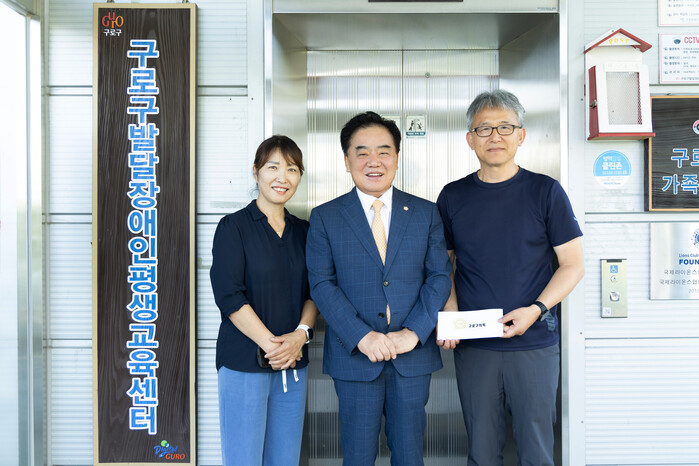 | ▲ 정대근 의장(가운데)이 복지시설을 찾아 위문금을 전달하고 있다. (사진 = 구로구의회 제공) |