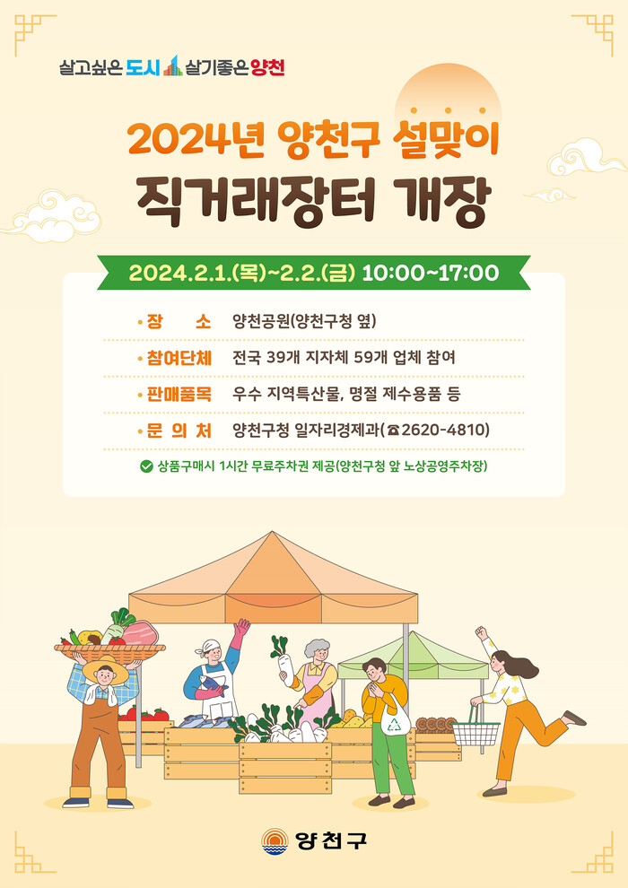 [시민일보 = 이대우 기자] 서울 양천구(구청장 이기재)는 민족 최대 명절인 설을 맞아 오는 2월1~2일 이틀간 양천공원에서 ‘2024년 설맞이 직거래 장터’를 운영한다고 밝혔다.