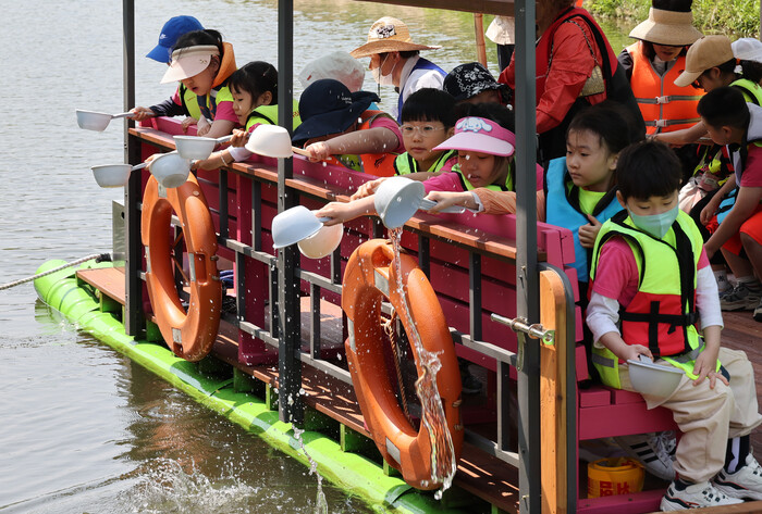 9일 서울 서초구 양재천에서 초등학생들이 뗏목체험 중 미꾸라지를 방류하고 있다. 서초구는 천천히 생태하천을 즐기는 의미로 '양재천 천천투어'를 하고 있다. 모이주기, 수질정화시설견학, 미꾸라지 방류, 뗏목 체험 등이 있다. 10월까지 매일 2회 무료로 진행한다. 서울시 공공서비스 예약시스템에서 신청할 수 있다.