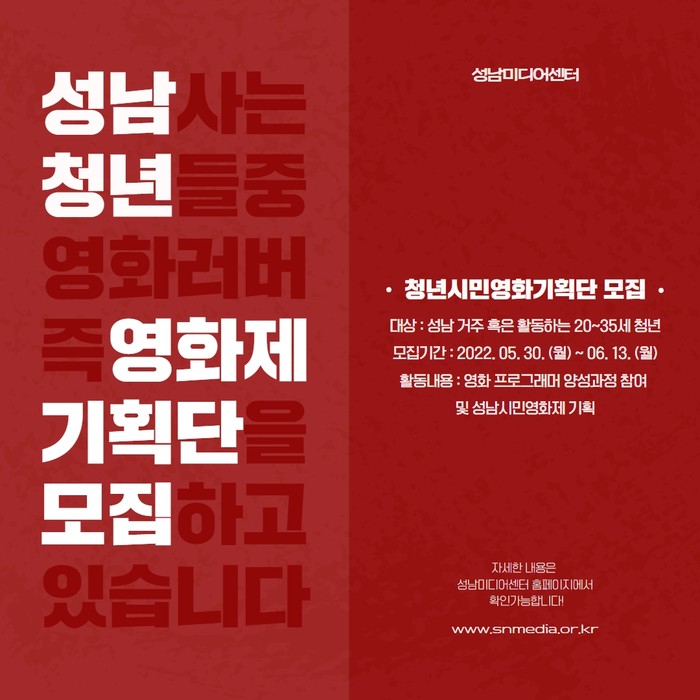 ‘청년 시민영화기획단’은 성남시에 거주하거나 성남에서 활동하는 20~35세 청년 8명을 모집하며, 오는 5월 31일(화)부터 6월 13일(월)까지 성남미디어센터 홈페이지에서 신청할 수 있다.