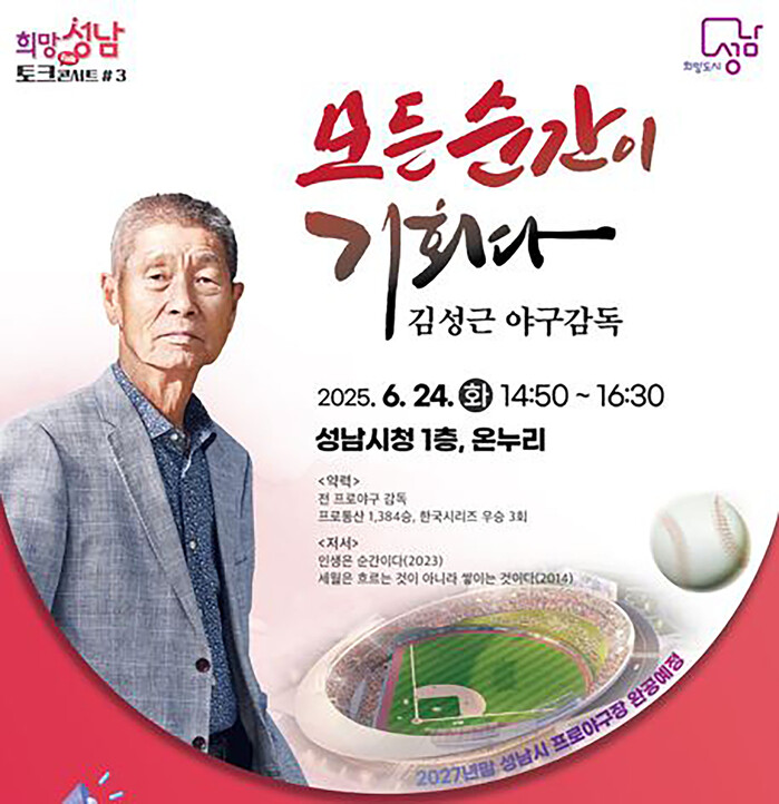 [성남=오왕석 기자] 성남시는 ‘야구의 신’이라 불리는 김성근(82) 야구 감독을 초빙해 오는 6월 24일 오후 2시 50분 시청 1층 온누리에서 ‘희망성남 토크콘서트 3강’을 연다.