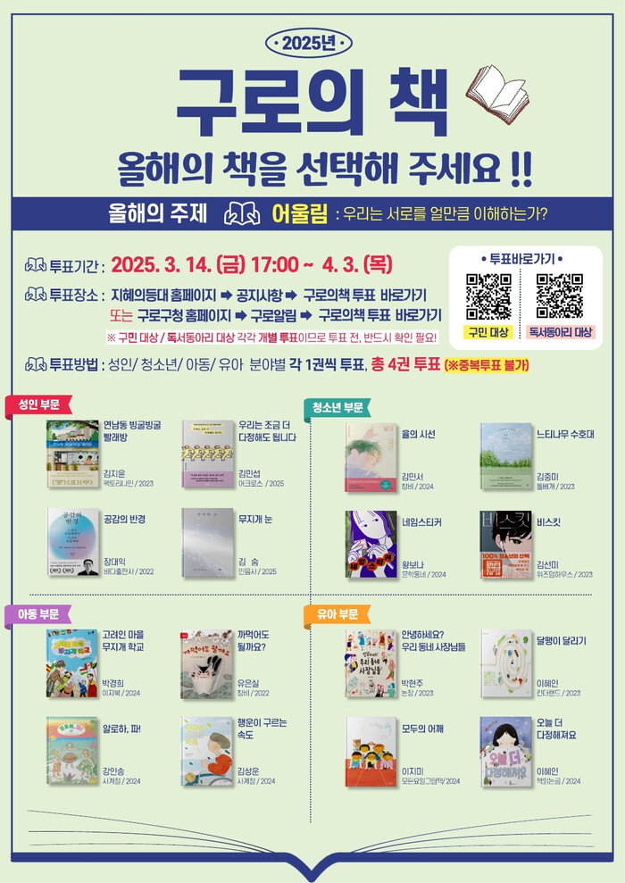 올해 ‘구로의 책’ 주제는 ‘어울림: 우리는 서로를 얼만큼 이해하는가?’다. 후보 도서는 ▲성인 부분 ‘연남동 빙굴빙굴 빨래방(김지윤)’, ‘우리는 조금 더 다정해도 됩니다(김민섭)’, ‘공감의 반경(장대익)’, ‘무지개 눈(김숨)’ ▲청소년 부문 ‘율의 시선(김민서)’, ‘느티나무 수호대(김중미)’, ‘네임스티커(황보나)’, ‘비스킷(김선미)’ ▲아동 부문 ‘고려인 마을 무지개 학교(박경희)’, ‘까먹어도 될까요?(유은실)’, ‘알로하, 파!(강인송)’, ‘행운이 구르는 속도(김성운)’ ▲유아 부문 ‘안녕하세요? 우리 동네 사장님들(박현주)’, ‘달팽이 달리기(이혜인)’, ‘모두의 어깨(이지미)’, ‘오늘이 더 다정해져요(이혜인)’다.