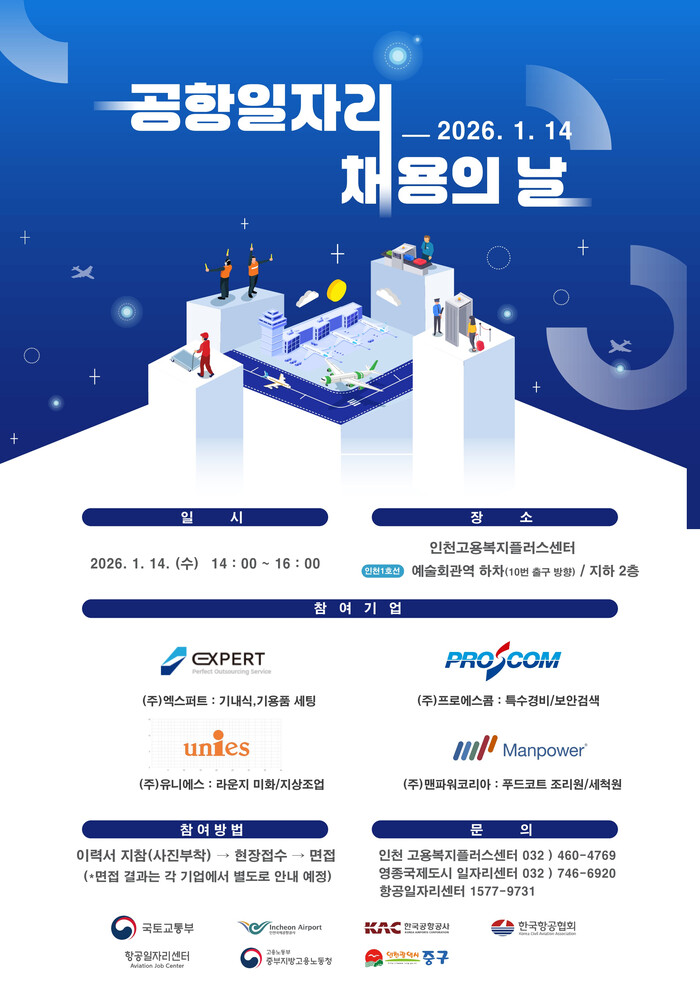 [인천=문찬식 기자] 인천 중구(구청장 김정헌)는 오는 14일 구월동 소재 인천고용복지플러스센터 지하 2층 채용행사장(남동구 문화로 131)에서 ‘2026년도 제1회 공항일자리 채용의 날’ 행사를 개최한다.