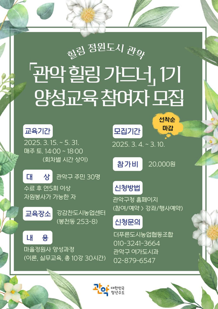 구는 올해 30명의 관악힐링가드너를 양성할 계획이며, 식물과 정원에 관심 있는 구민을 모집한다. 단, 교육 수료 후 연 5회 이상 자원봉사 및 지역내 정원 관련 행사에 참여해야 한다.