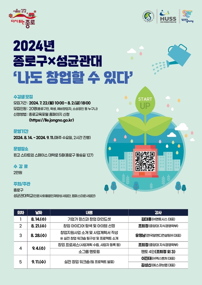 구가 주최하고 성균관대학교에서 주관하는 본 교육은 8월 14일부터 9월 11일까지 매주 수요일 15:00~17:00 킹고 스타트업 스페이스 대학로 5층(동숭길 127)에서 열린다.