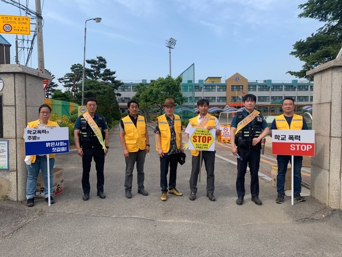 경기 포천시 가산면 청소년지도협의회는 학교폭력과 흡연에 대한 경각심을 일깨우고 안전한 학교 환경을 조성하기 위해 최근 가산파출소와 함께 경북중학교 정문에서 학교폭력 예방 및 금연 캠페인을 실시했다. 사진은 이날 캠페인 참여자들이 기념촬영을 하고 있는 모습. (사진제공=포천시청)
