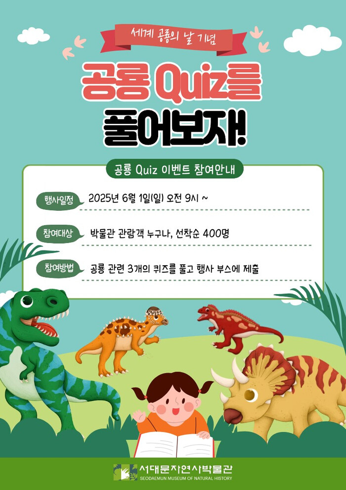 [시민일보 = 이대우 기자] 서대문구(구청장 이성헌)가 ‘세계 공룡의 날’을 맞아 오는 6월1일 오전 9시부터 서대문자연사박물관 1층 중앙홀 로비에서 공룡을 주제로 한 퀴즈 이벤트를 진행한다.