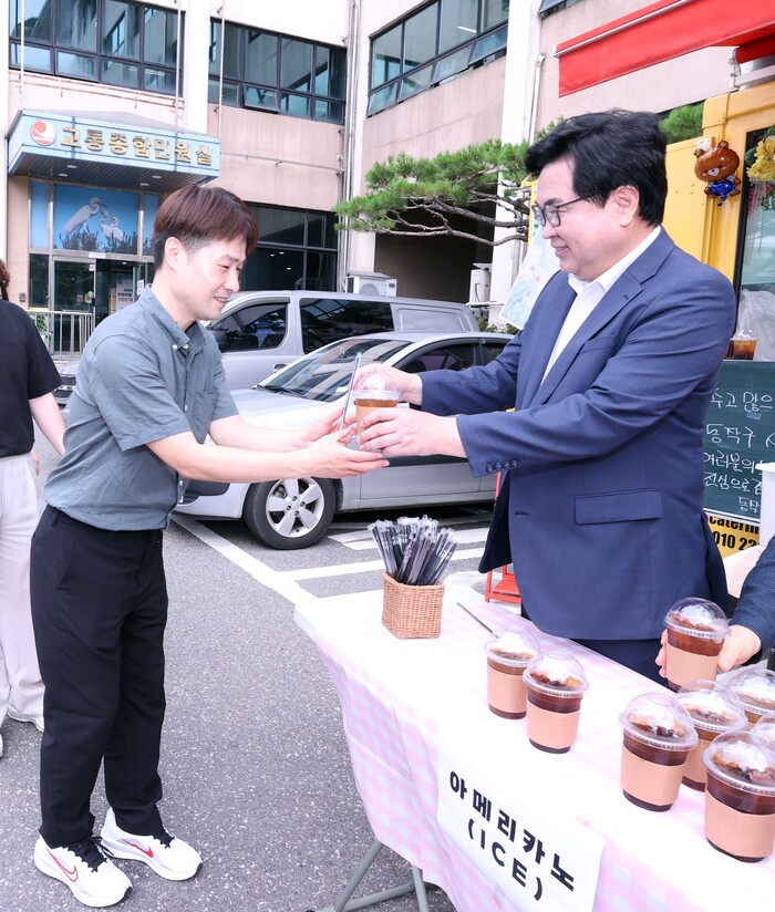 | ▲ 박일하 동작구청장이 민선8기 2주년을 맞아 그간 함께 노력해온 직원들에게 커피를 나눠주고 격려의 말을 전하는 커피차 이벤트를 실시했다. (사진=동작구청 제공) |