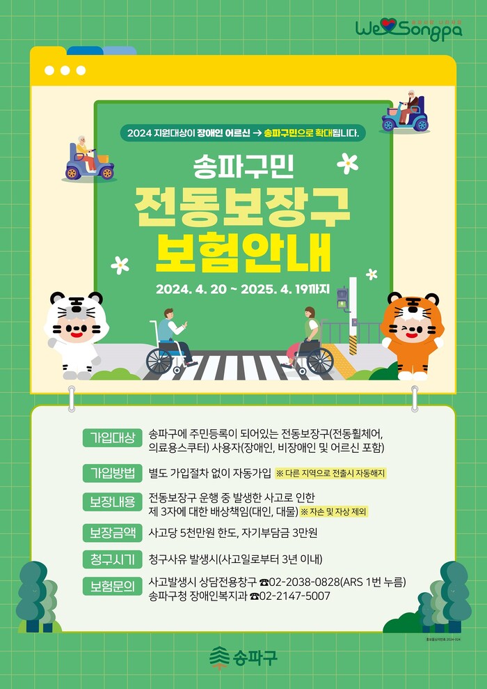 구는 지난해 전동보장구를 이용하는 장애인 및 어르신의 경제적 부담을 줄이고 이동권을 보장하고자 「서울특별시 송파구 장애인 전동보장구 보험 가입 및 지원 조례」를 제정하고, 전동보장구 배상책임 보험을 시행하였다.