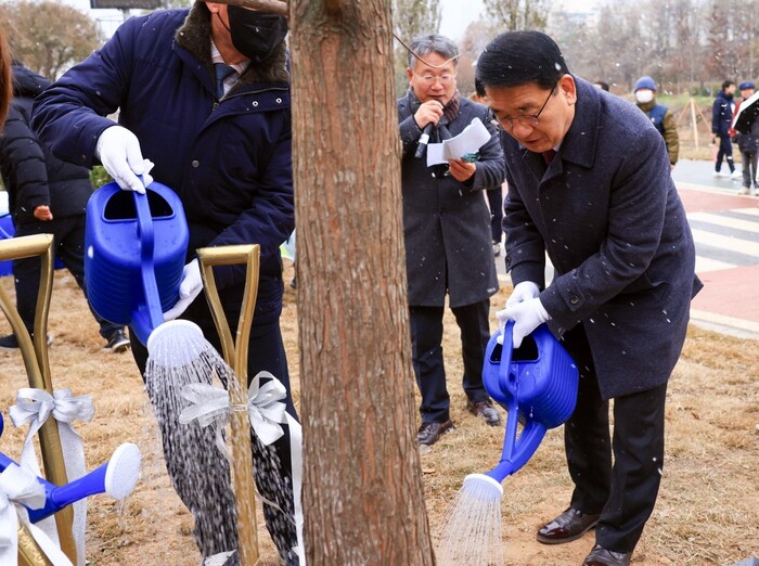 | ▲ 문헌일 구청장이 기념식수 후 물을 주고 있다. (사진=구로구청 제공) |