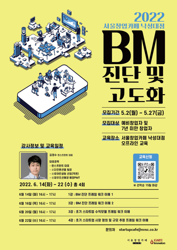 교육은 오는 6월14~22일 총 4회에 걸쳐 현재 액셀러레이터로 활동 중이면서 BM고도화에 특화된 김정수 강사(린스프린트 대표)가 맡아 서울창업카페 낙성대점에서 오프라인으로 진행할 예정이다.