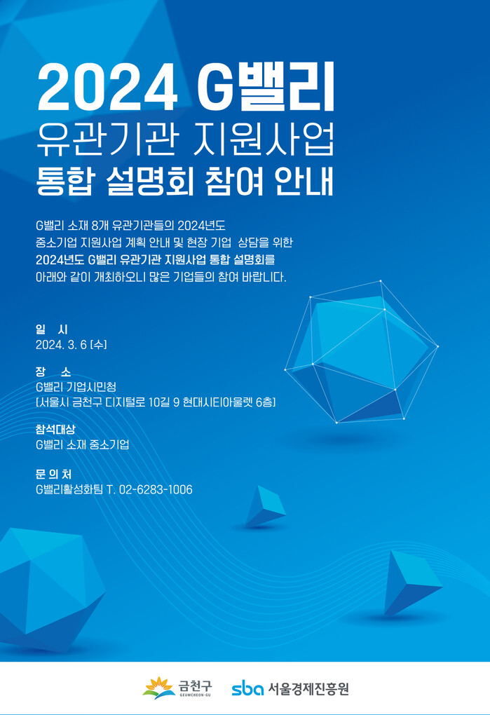 [시민일보 = 여영준 기자] 서울 금천구(구청장 유성훈)는 ‘G밸리 중소기업 지원사업 통합설명회’를 서울경제진흥원, 한국산업단지공단 등 8개 기관과 공동으로 G밸리 기업시민청에서 3월 6일 오후 2시에 개최한다고 밝혔다.