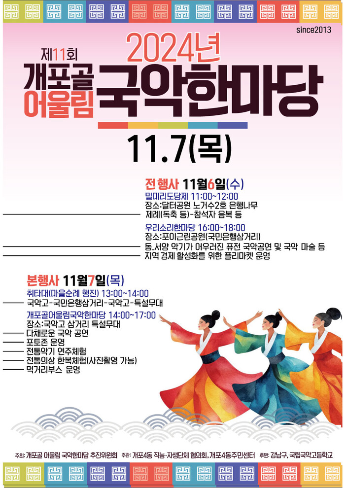 [시민일보 = 이대우 기자] 꿈이 모이는 도시, 미래를 그리는 강남구(구청장 조성명) 개포4동이 오는 6일과 7일 양일간 제11회 개포골 어울림 국악한마당 축제를 연다.